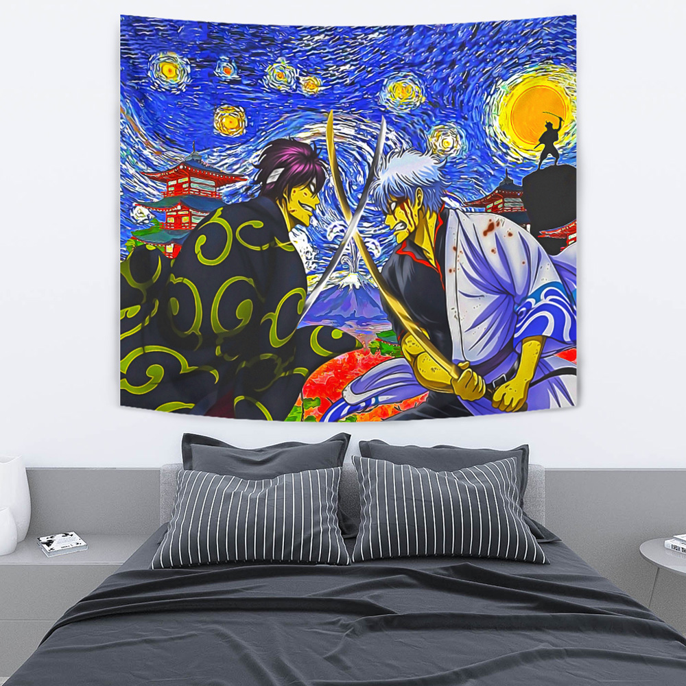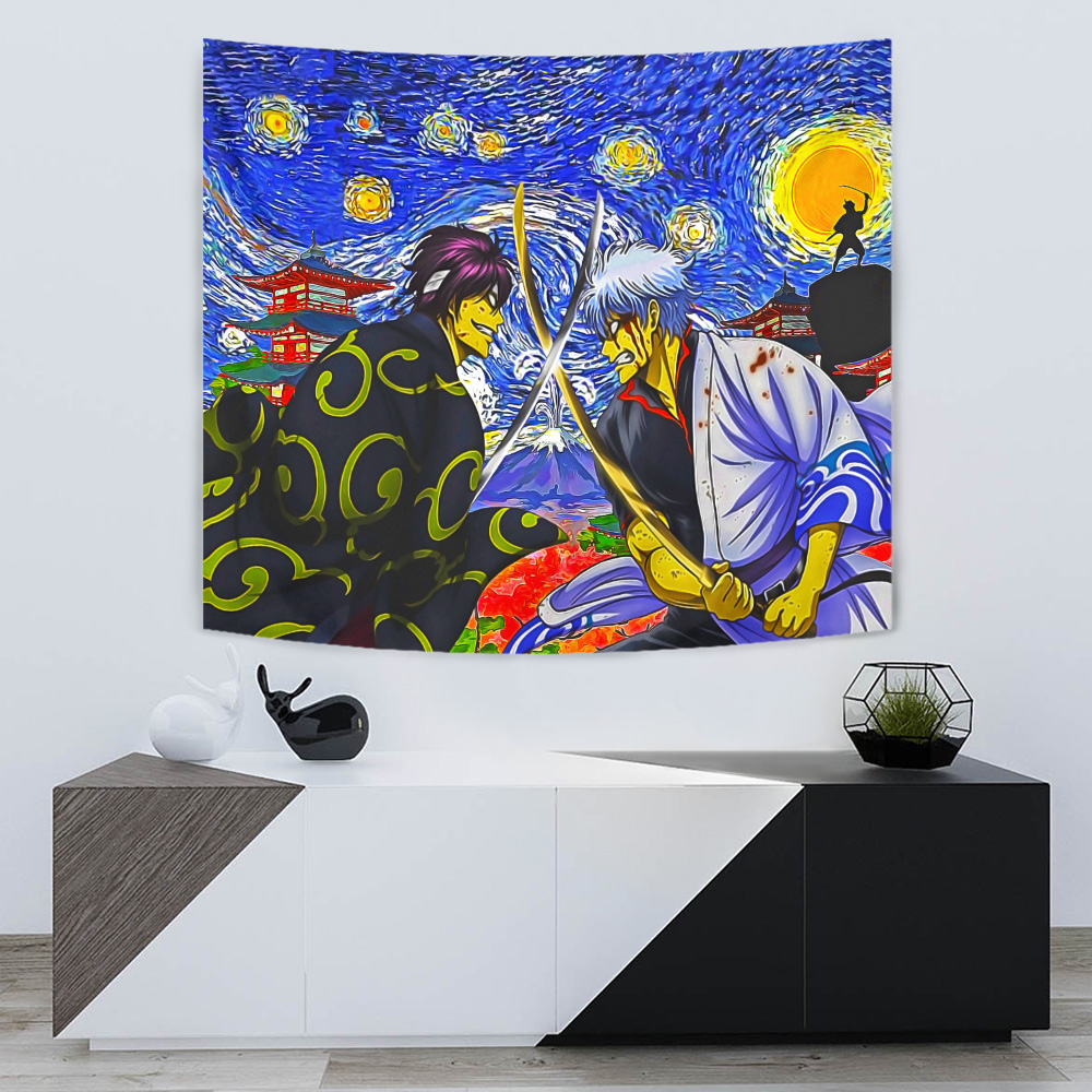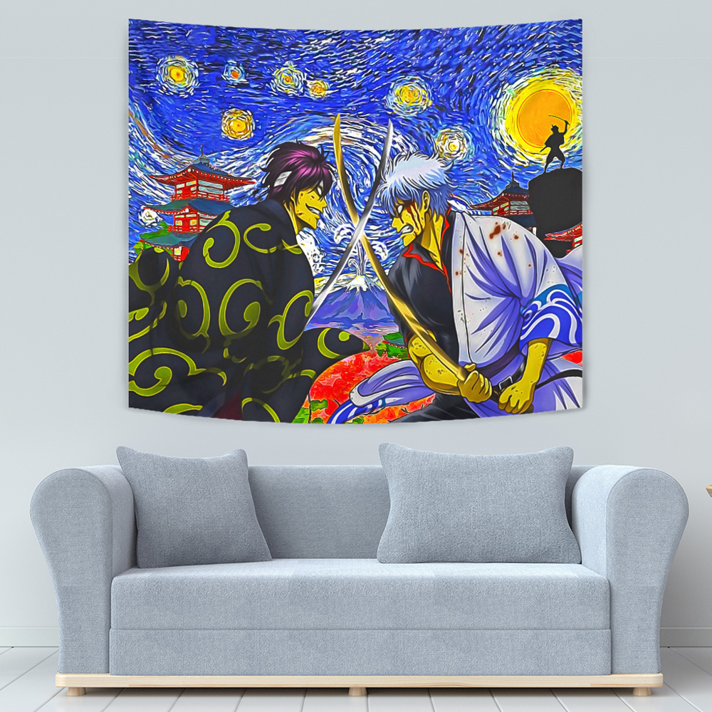 Introducing the Samurai Warriors Gintama Starry Night Tapestry, a mesmerizing fusion of two beloved anime worlds. This tapestry combines the iconic characters from Samurai Warriors and Gintama with the timeless beauty of Van Gogh’s Starry Night.