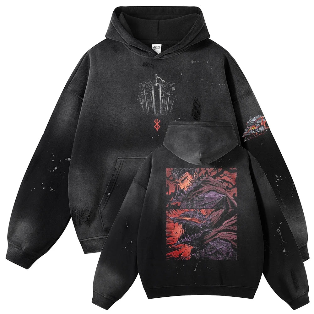 The Berserk Anime Guts Fury Graphic Oversized Vintage Hoodie isn’t just a garment; it’s an extension of your fandom, a testimony to the thrilling journey of Guts. Wear it with pride and let the world acknowledge your admiration for the groundbreaking anime.