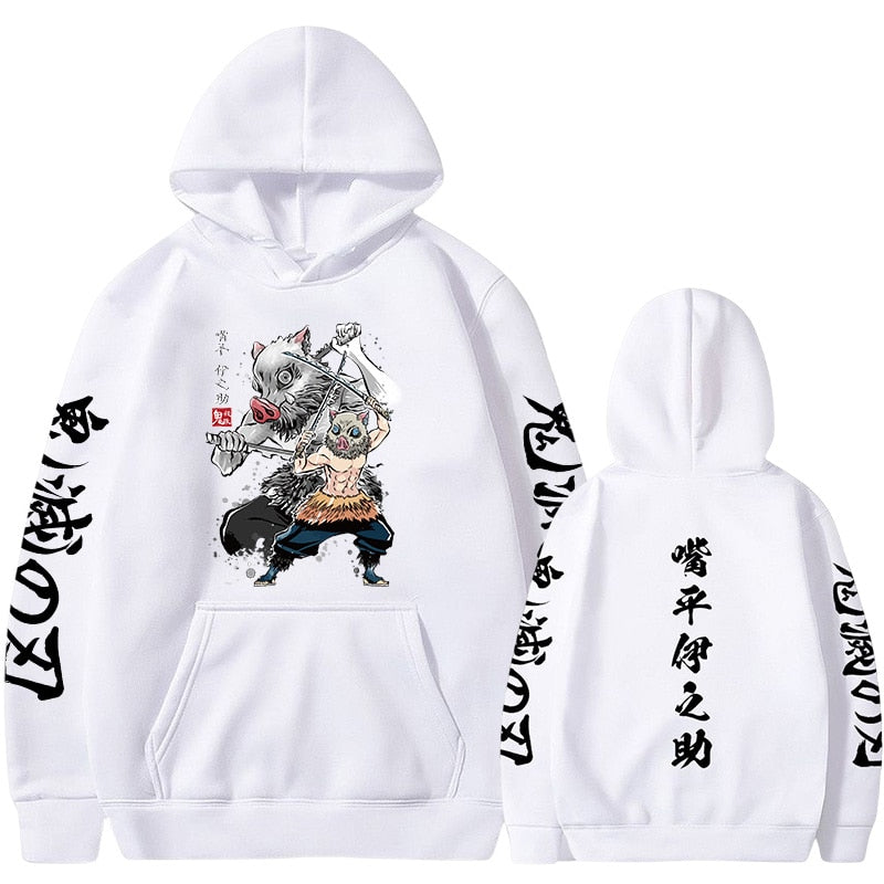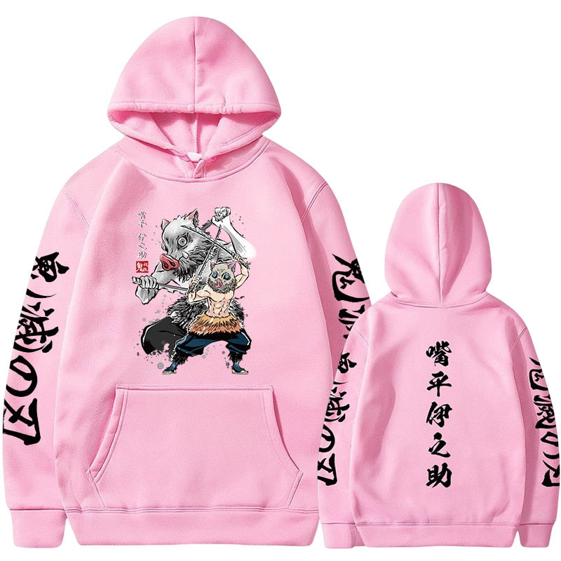If you’re new to Demon Slayer, it’s a mesmerizing anime series revolving around Tanjiro Kamado, a charcoal seller turned demon slayer who embarks on a quest to save his sister, Nezuko. Inosuke, our hoodie’s star, is one of Tanjiro’s most loyal comrades, wielding a unique pair of serrated swords to battle the demonic forces.