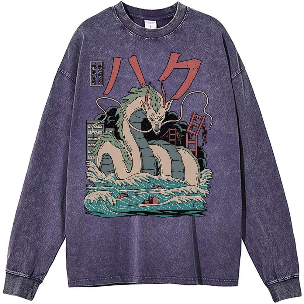Haku is not just a character; he is a symbol of transformation and loyalty in the realm of Spirited Away. As Chihiro’s mysterious guide, Haku embodies the spirit of friendship and bravery as they navigate the challenges of the spirit world. The Spirited Away Vintage Haku Long Sleeve Shirt allows fans to wear a piece of this enchanting story while celebrating Haku’s pivotal role in Chihiro’s journey.