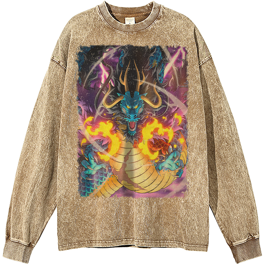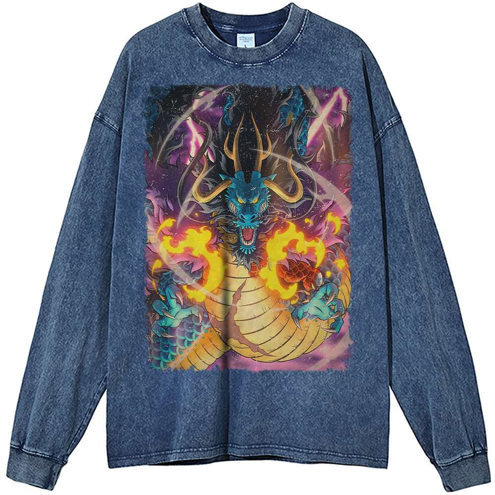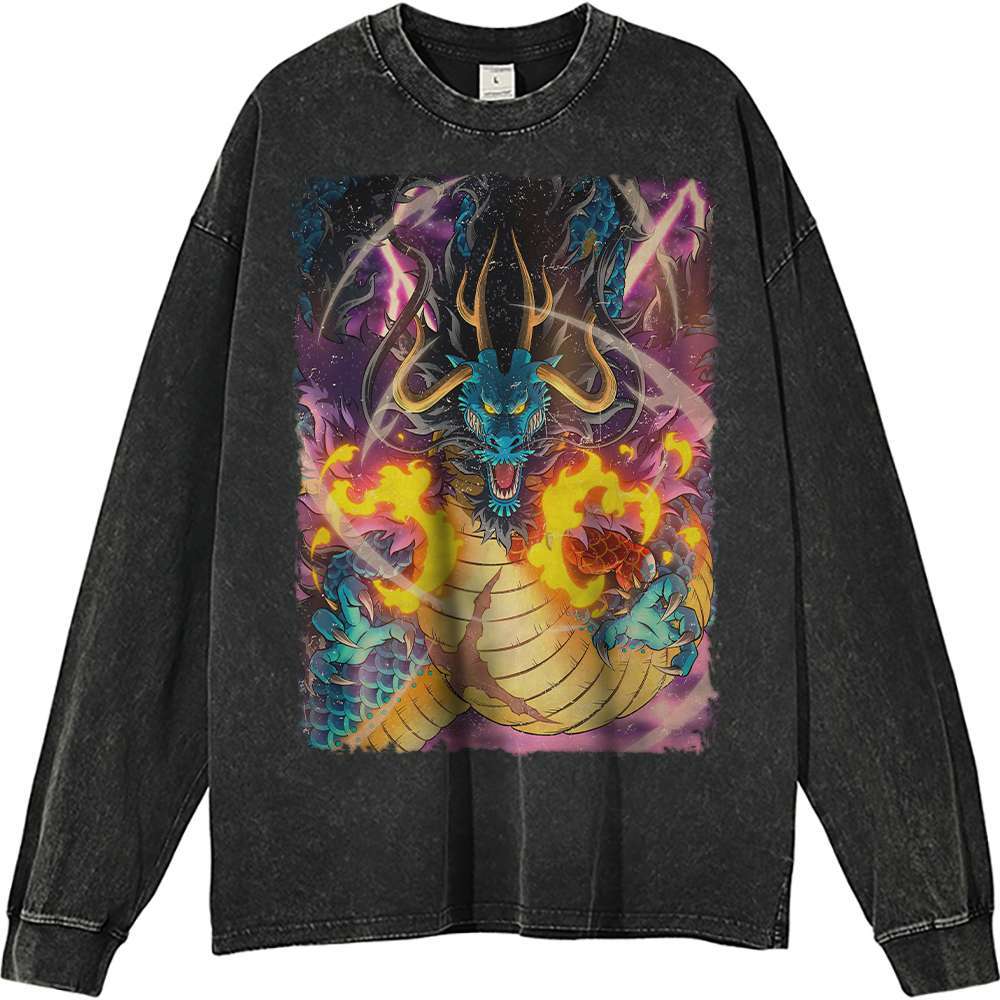 Kaido, a pivotal character in the world-renowned anime One Piece, is notorious for his overwhelming power and relentless ambition. As a member of the Beast Pirates, he embodies the spirit of adventure and conflict that One Piece is known for. The Kaido One Piece Vintage Anime Long Sleeve Shirt for Men showcases his iconic dragon form, making it a must-have for any true fan. Wearing this shirt not only celebrates Kaido’s legacy but also expresses your love for the thrilling world he inhabits.