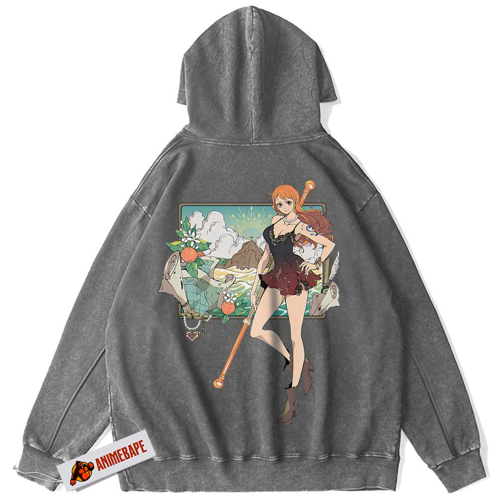 Nami, the treasure-hunting navigator of the Straw Hat Pirates in One Piece, is not only essential to the crew’s adventures but also a fan favorite for her tenacity, intelligence, and undeniable charm. Known for her strategic prowess and navigational skills, Nami plays a crucial role in guiding her friends through perilous waters and legendary mysteries. The One Piece Vintage Nami Hoodie captures her adventurous essence, making it an essential piece for anyone who admires her character.