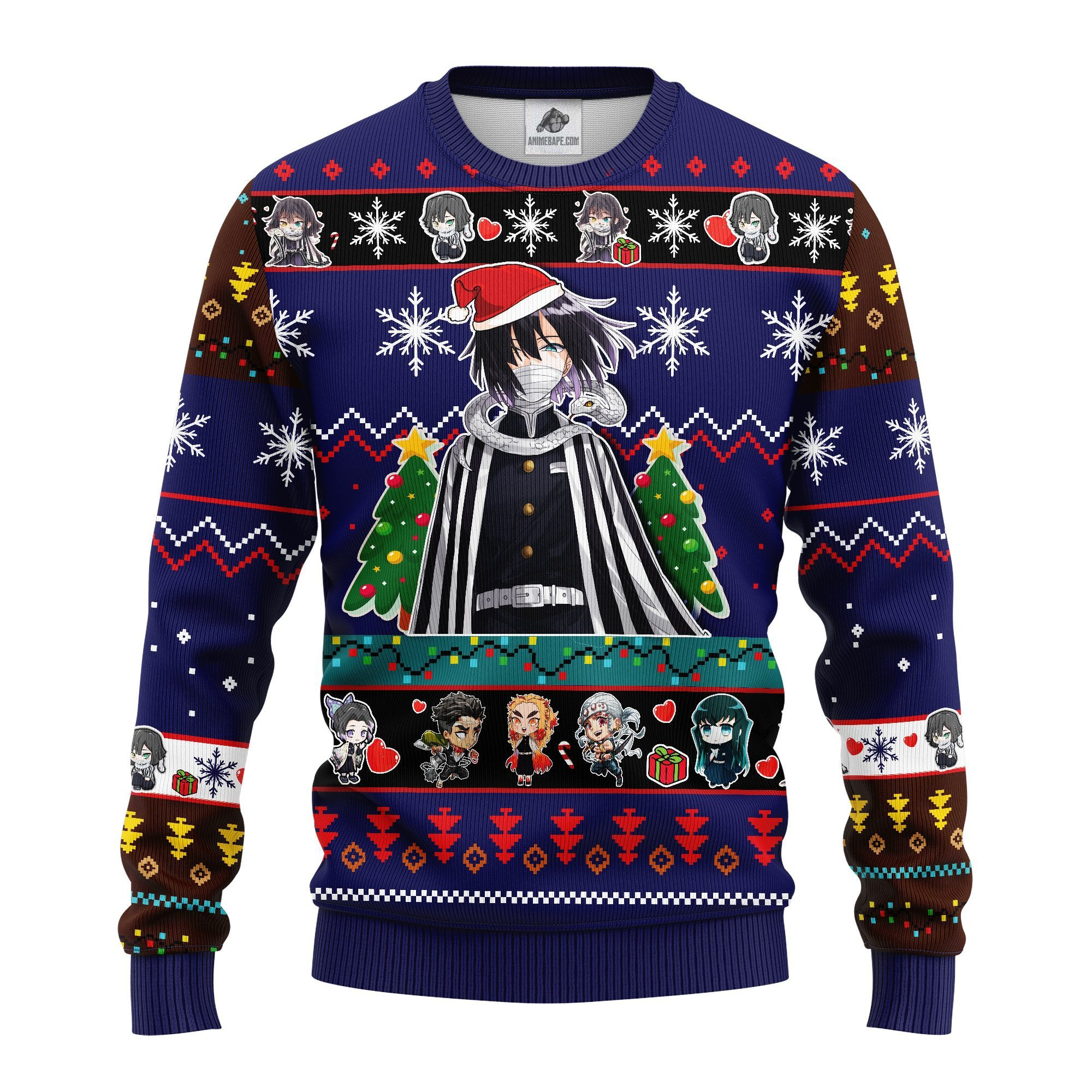 Obanai Iguro, known for his snake motif and unwavering dedication, is a member of the elite Demon Slayer Corps. With a distinct personality and a remarkable fighting style, Obanai stands out as a fan favorite. This ugly Christmas sweater pays homage to his iconic look and fierce determination, making it a perfect way for fans to express their love for this remarkable character. Whether you’re inside a cozy cabin or at a lively holiday party, this sweater is bound to spark conversations and admiration.