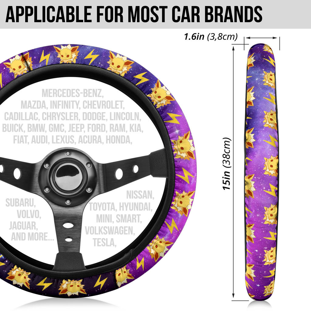 Transform your driving experience with the captivating Pokemon Galaxy Jolteon Eevee Evolution Car Steering Wheel Cover. This unique steering wheel cover features stunning graphics of Jolteon, one of the most beloved Eevee evolutions. The vibrant design combines the allure of the cosmos with the electrifying essence of Jolteon, making it an eye-catching accessory for any car enthusiast and Pokémon fan.