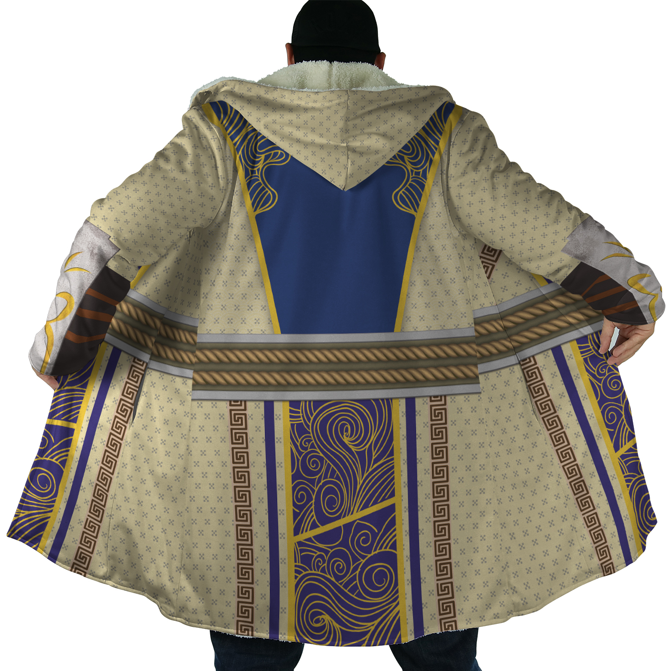 - Custom all-over print Hooded Cloak Coat’s outer fabric is polyester cotton, the inner is short pile faux fur fabric.