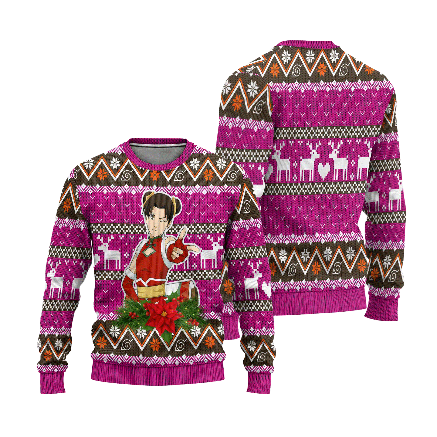 Tenten is a skilled kunoichi from the Hidden Leaf Village and a member of Team Guy. Known for her exceptional weapon mastery and determination, Tenten has won the hearts of fans with her dedication to becoming the best. This custom ugly Christmas sweater highlights Tenten in all her glory, capturing her fighting spirit and adding a touch of anime magic to your holiday wardrobe. Wearing this sweater is not just about keeping warm; it’s about celebrating Tenten and her journey in the Naruto universe.