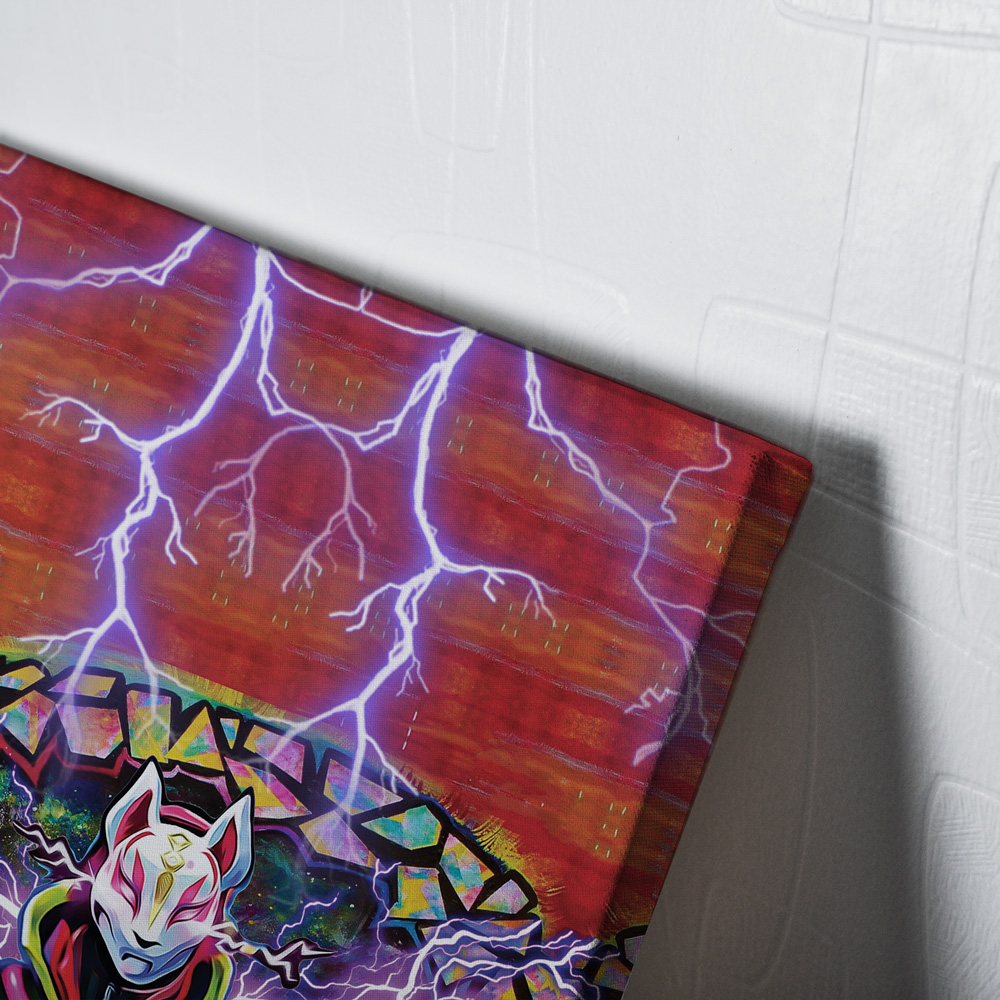Dive into the mesmerizing world of Fortnite with our Trippy Kitsune Drift Mask Canvas Print Wall Art. Unleash your inner warrior and showcase your love for anime and gaming with this captivating piece.