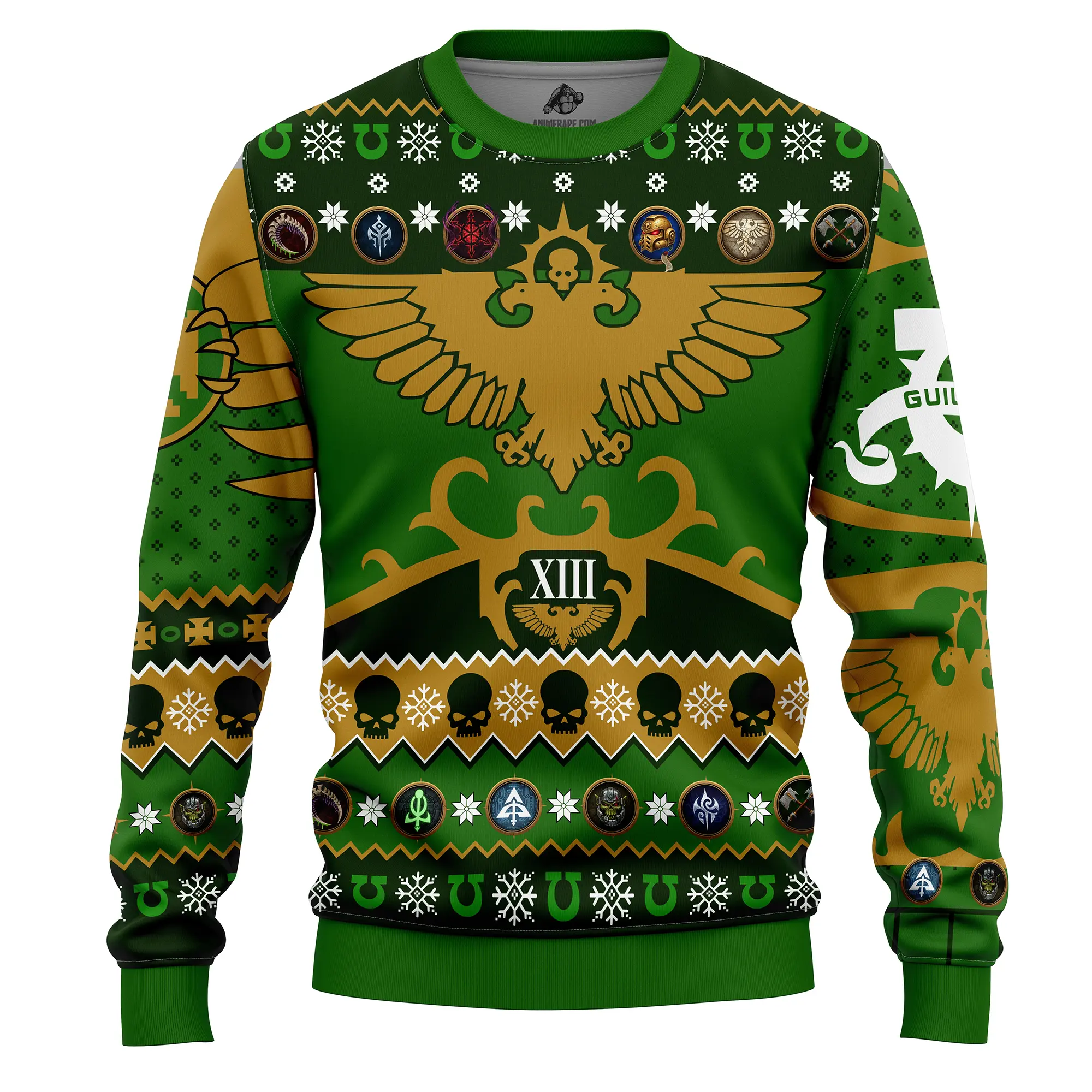 Command festive glory with this epic, faction-inspired Christmas sweater featuring a massive golden eagle crest, battle insignias, and bold heraldic patterns across a deep green and gold backdrop. Intricate skull motifs, snowflakes, horseshoes, and rank-style emblems wrap the design in a perfect mix of holiday cheer and war-torn aesthetic.